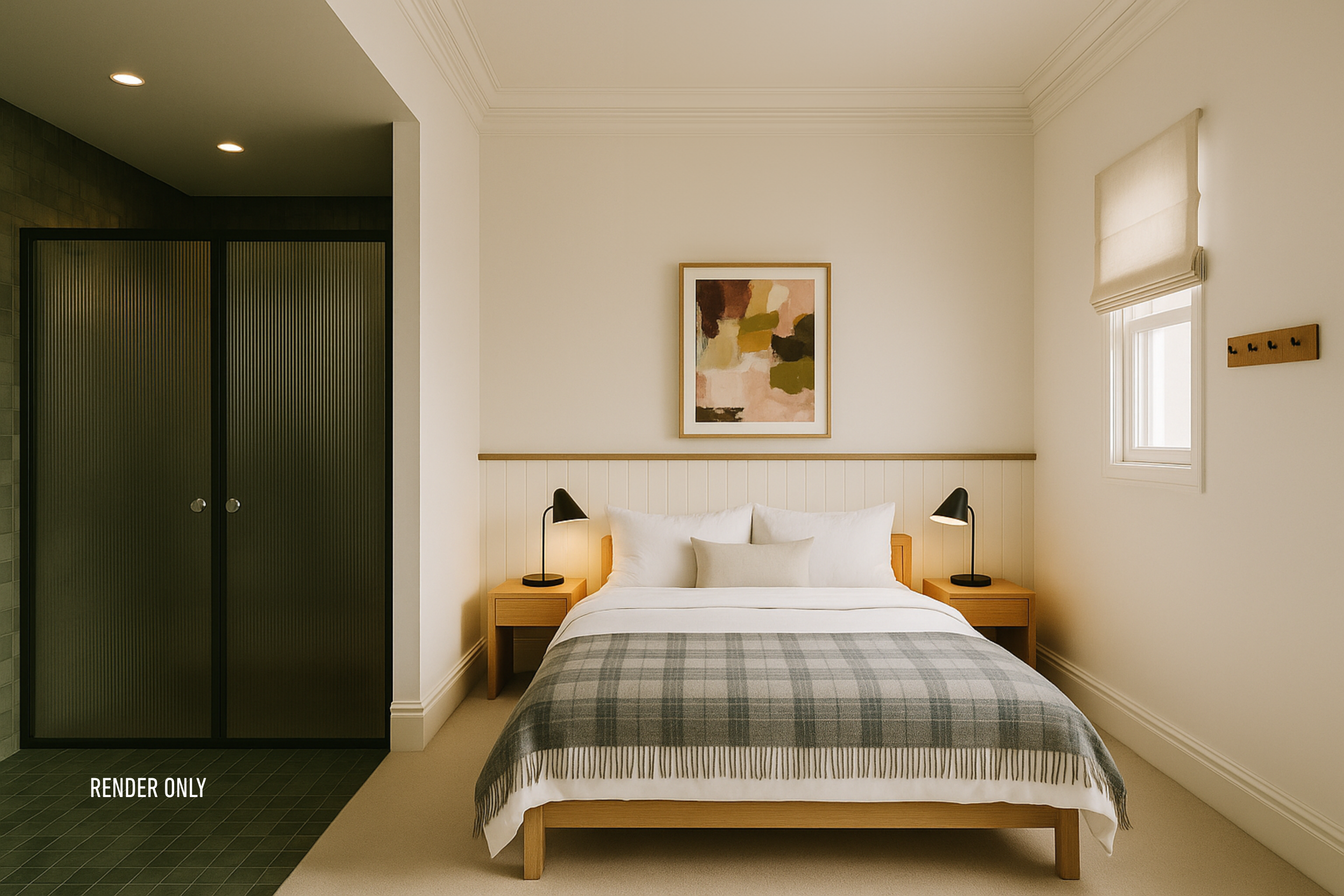 A cosy, bright room blending old-world pub charm with modern comfort. King bed, private ensuite, air-conditioning, and high ceilings make it perfect for couples or solo guests. Timber accents and contemporary touches complete the quintessential Queenslander stay.